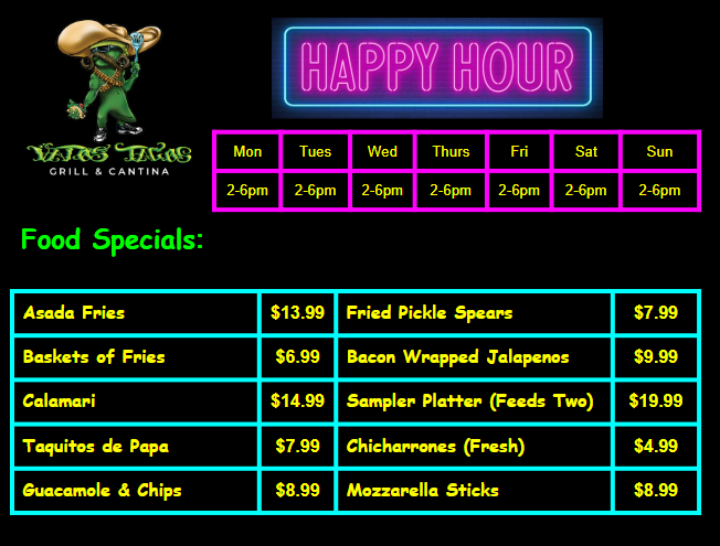 Vatos Tacos- Happy HourBy Joe’ll Chaidez / February 12, 2026 Happy Hour Vatos Tacos- Happy Hour Contact Info vatostacoscantina.com